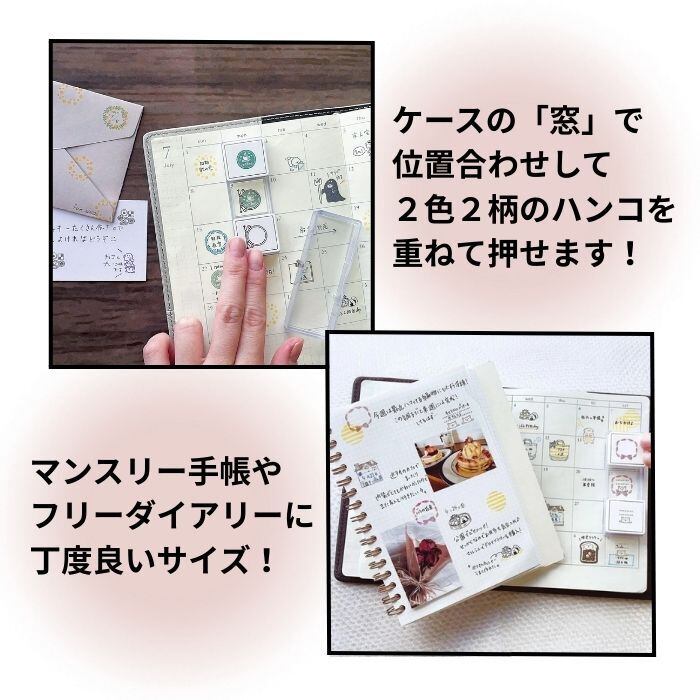 ・ケースの「窓」で位置合わせして2色2柄のハンコを重ねて押せます!