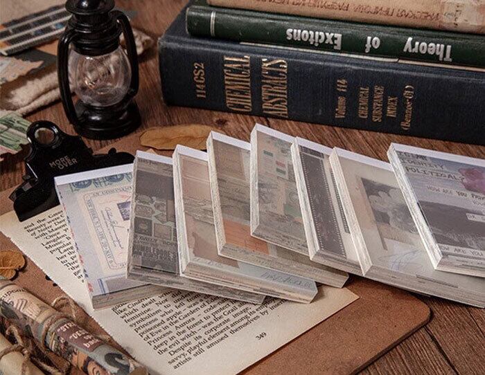 コラージュをテーマとしたメモパッドです。お花、スタンプやいろんな絵柄をレトロ感がある色味で表現し、オシャレで素敵な雰囲気が出ます。